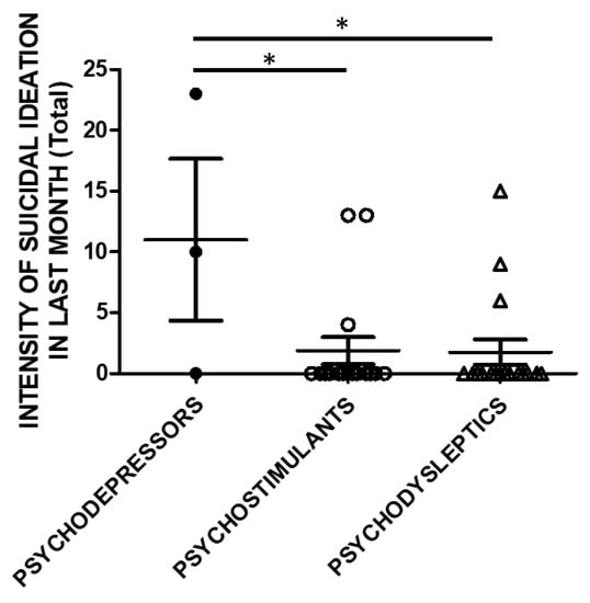 SSI in the previous month (Total score) and categories of substances. Three subjects used psychodepressors, 16 psychostimulants, and 17 psychodysleptics. Statistical analysis employed One Way ANOVA, followed by Tukey’s post-hoc test, F = 4.488, df = 2, * p < 0.05).