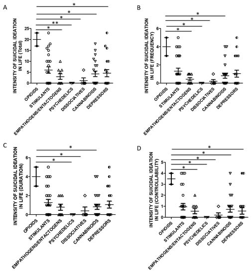SSI in life and groups of substances (A)-Total Score, opioids n = 2, stimulants n = 25, empathogens/entactogens n = 9; psychedelics n = 4, dissociatives n = 5, cannabinoids n = 22, depressors n = 19. One Way ANOVA, followed by Tukey’s post-hoc test, F = 2.902, df = 6, * p < 0.05, ** p < 0.01; (B)-Frequency, opioids n = 2, stimulants n = 25, empathogens/enthactogens n = 9; psychedelics n = 4, dissociatives n = 5, cannabinoids n = 22, depressors n = 19. One Way ANOVA, followed by Tukey’s post-hoc test, F = 2.595, df = 6, * p < 0.05; (C)-Duration, opioids n = 2, stimulants n = 25, empathogens/entactogens n = 9; psychedelics n = 4, dissociatives n = 5, cannabinoids n = 22, depressors n = 19, One Way ANOVA, followed by Tukey’s post-hoc test, F = 2.248, df = 6, * p < 0.05; (D)-Controllability opioids n = 2, stimulants n = 25, empathogens/enthactogens n = 9; psychedelics n = 4, dissociatives n = 5, cannabinoids n = 21, depressors n = 19, One Way ANOVA, followed by Tukey’s post-hoc test, F = 2.440, df = 6, * p < 0.05).