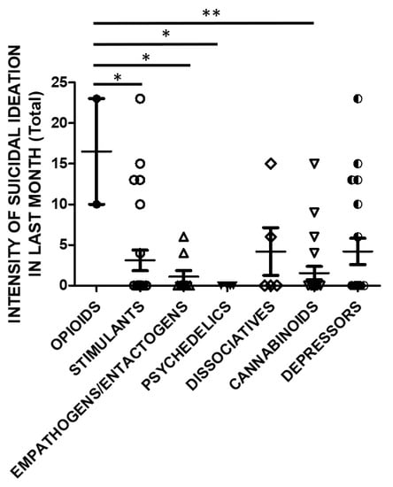 SSI in last month (Total Score) and groups of substances (opioids n = 2, stimulants n = 25, empathogens/entactogens n = 9; psychedelics n = 4, dissociatives n = 5, cannabinoids n = 22, depressors n = 19; One Way ANOVA, followed by Tukey’s post-hoc test, F = 2.754, df = 6, * p < 0.05, ** p < 0.01).