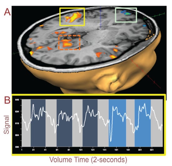 The subject wore headphones (MR Confon, Magdeburg, Germany) to listen to the music while in the scanner and was given a choice as to whether to have eyes open or closed for the duration of the scan. The trance-inducing music task employed a blocked design 30 s OFF and 60 s ON; ON states were alternated five times with 30-s periods of rest for a total scan time of 8-min. Task 2 used the same timing structure and was designed to provide an independent functional localization of right foot motor areas; our subject was visually cued with the word “wiggle” at the center of the projected screen in the scanner and trained on this task before entering the scanner. As the trance process under investigation normally involves movement and/or dance (motor circuitry), the purpose of this task is to map the foot network (see more details in [9,13]), providing an independent measure that can be used to probe brain regions for trance perception. These tasks were analyzed using the General Linear Model (GLM) in BrainVoyager QX (Brain Innovation v2.1.1.1542, Maastricht, The Netherlands) using the boxcar function convolved with a double gamma hemodynamic response function and the subject’s perception of trance [0; 0.5; 1]. Following statistical analysis, blood-oxygen-dependent (BOLD) signal data was analyzed in MATLAB (The MathWorks Inc., Natick, MA, U.S.A. Version 8.4.0.150421, 2014b).