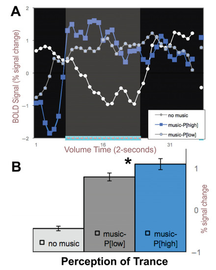 Our approach to this study is scaffolded on simultaneous research involving groups of experts (break-dancers, ballet dancers, choreographers) who regularly engage in music-driven behaviors, such as associated or learned movements and states. Experts have putative specialized neural circuits for behaviors related to their area of expertise that can be probed for brain–behavior relationships [9] and potentially used in training to reduce neurodegeneration [10,11]. These brain–behavior associations can be further elaborated through a “first-person neuroscience” approach [12], correlating brain changes with the practitioner’s subjective experience. The aim of this study was to examine brain regions showing an interaction with the expert subjects’ percepts, correlating increases in modulation with a high/low perception of trance. Additionally, anatomical [3] and functionally [13] mapped brain regions of interest were used from [3,13] to guide our inquiry into trance perception.