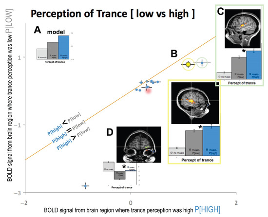 (A) The Model BOLD signal if trance has a P[HIGH] modulated by the music signal. The diagonal orange line represents where low and high trance perception is equal with data below and above the line as the differences. (B) Same brain area as in Figure 1A from the right auditory cortex. (C) Left auditory cortex bar plots and location. (D) Orbitofrontal cortex bar plot and spatial location, Talairach coordinates; x = −24; y = 63; z = 5. Brodmann Area 10. Other data points that were examined from functional ROIs clustered near the orange line. Red drop shading for two data points signifies anatomical regions from [3]. *- denotes significant p < 0.05.