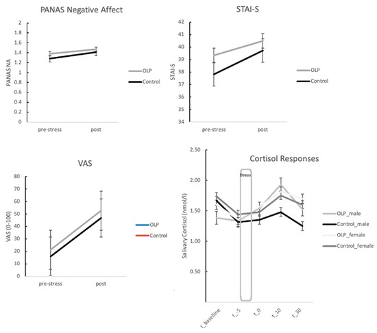 Results of a repeated measures ANOVA with factor time (three time points—t_−5, t_0, t_10) and group (OLP vs. control) for perceived stress marked on the VAS revealed a strong main effect for time (F(2, 102) = 27.24, p < 0.001), indicating that the stress manipulation was successful, but no interaction with the group (F(2, 102) = 0.58, p > 0.10).