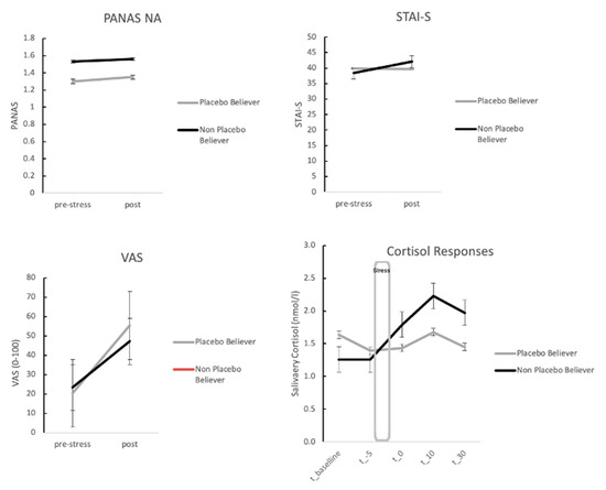 A repeated measures ANOVA on self-reported stress (VAS) with time (three time points) as within and belief group as a between-subjects factor (high vs. low placebo belief) replicated the significant main effect on time. We did not find a significant interaction for self-reported stress scores with respect to high vs. low placebo belief (main effect time—F(2, 44) = 12.06, p < 0.001; interaction—F(2, 44) = 0.91, p > 0.10).