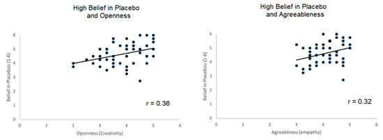 Scatterplot of belief in placebos scores and personality dimensions agreeableness and openness. Other personality dimensions failed to show significant correlations with high beliefs in placebos.