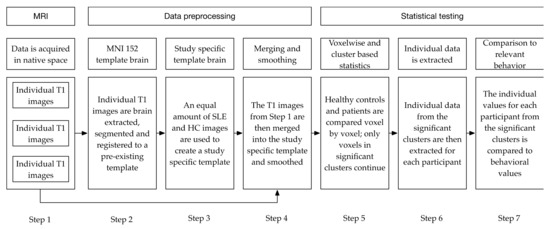 Data preprocessing. To investigate whether cerebral and/or cerebellar grey matter structure differed between SLE patients (NPSLE and non-NPSLE) and HC, a Voxel-Based Morphometry (VBM) analysis based on whole brain T1w MRI data was conducted. VBM is an automated technique that compares values across voxels between groups, e.g., diseased populations or controls. It is typically used to infer differences in brain tissue, the presence of atrophy or other related changes in tissue as an effect of disease [59]. Structural data were preprocessed using a standard VBM protocol using FSL tools [60,61,62]; http://fsl.fmrib.ox.ac.uk/fsl/fslwiki/FSLVBM, accessed on 16 April 2021. Figure 4 shows a schematic overview of the different preprocessing steps. T1-weighted images were brain-extracted and grey matter-segmented before registering them to MNI 152 standard space using non-linear registration [63]. The resulting images were then averaged and flipped along the x-axis to create a left-right symmetric, study-specific grey matter template, which was based on an equal amount of SLE patients and controls. Next, all native grey matter images were non-linearly registered to the study-specific template. The resulting grey matter images were smoothed using an isotropic Gaussian kernel with a sigma of 2 mm.