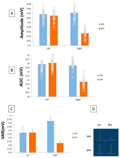 The peak (A), AUC (area under the curve) (B) and SD (standard deviation) (C) across Hemisphere for 1PP and 3PP. In all 3 measures, the 1PP Right Hemisphere condition differed significantly from all other conditions (all p < 0.05). All other comparisons were non-significant. A representative rectified, smoothed MEP is given for the 1PP (D) for RH and LH.