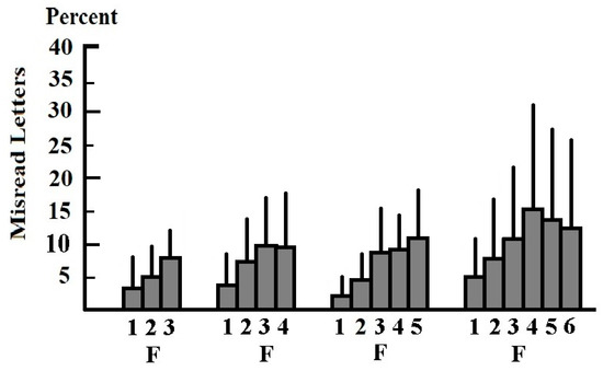 Percentage of incorrectly read letters in 3-letter, 4-letter, 5-letter, and 6-letter pseudowords according to their location in the words. Vertical bars above columns indicate standard deviation. The letters were either omitted, replaced by other letters, or shifted to an incorrect position. Numbers denote the letters in the pseudowords from left to right. F denotes the letter that occurred at the fixation point. The rate of incorrectly read letters increased from left to right. The rate of reading mistakes was lowest for the first letter. In 3-letter and 4-letter pseudowords it was highest for the third letter, in 5-letter pseudowords for the fifth letter, and in 6-letter pseudowords for the fourth letter.