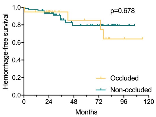 In terms of postoperative rupture risk, 14 postoperative hemorrhagic events occurred in 14 hemispheres (14.9%) (4 in the occluded group and 10 in the non-occluded group, p = 0.629) during a total of 378.6 patient-years clinical follow-ups, translating to a postoperative annualized rupture risk of 3.7%. The postoperative annualized rupture risk was significantly decreased compared with the natural annualized re-rupture risk (3.7% vs. 9.3%, p = 0.010). The Poisson rate test of annualized rupture risk showed no significant differences between the occluded group and the non-occluded group (4.4% vs. 3.5%, p = 0.679). Kaplan–Meier analysis proposed no significant differences in postoperative hemorrhage-free survival between the two groups (p = 0.678) (Figure 2).