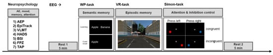 - Höller, Y.; Höhn, C.; Schwimmbeck, F.; Plancher, G.; Trinka, E. A virtual reality paradigm to assess episodic memory: Validation-dataset for six parallel versions and a structured behavioral assessment. Data Brief 2020, 29, 105279. [Google Scholar] [CrossRef]