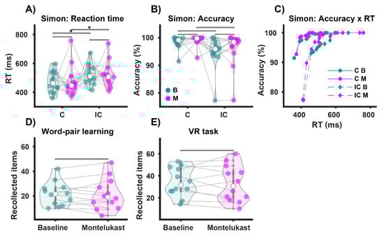 Behavioral results of the cognitive tests during the EEG. * p < 0.05. (A) Shows the reaction times for congruent (C) and incongruent (IC) trials of the Simon task. Participants were slower on the IC trials than on the C trials (Simon effect), both at baseline (B, green) and on the montelukast trials (M, purple). However, we observed no difference in response times when comparing baseline vs. montelukast for C and IC trials. In (B), accuracy indicates correct responses per condition as a percentage. We found no differences in accuracy for each comparison. (C) Shows accuracy as a function of response time. In the bottom panel, (D,E) show the results for participants’ performance on the memory tasks. There was no difference in the number of recalled word pairs for the semantic memory task (word pair learning, (D)), comparing baseline vs. montelukast. We also found no difference in the number of recalled items for the episodic memory task (navigation through a virtual town, (E)).