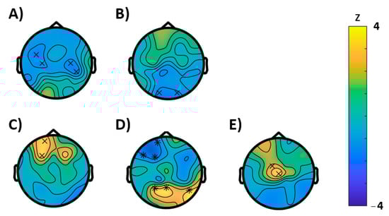 Results of the cluster based permutation tests (BASELINE vs. MONTELUKAST, cluster corrected, x = p < 0.05, * = p < 0.01). (A) Rest 1, entropy; (B) WP-task recall, Hjorth activity; (C–E) VR-task: (C) brain-rate, (D) entropy, and (E) Hjorth activity.