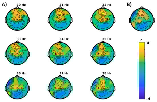 Results of the cluster based permutation tests for the congruent trials of the Simon task (BASELINE vs. MONTELUKAST, cluster corrected, x = p < 0.05, * = p < 0.01). (A) Cluster for spectral power and (B) Hjorth mobility.