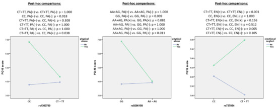Results of post hoc analyses are presented in Figure 1. Among the rs1360780 CC homozygotes, a history of PA was associated with significantly higher PQ-16 scores. This difference was not significant in the rs1360780 T allele carriers. Similar findings were observed for the rs9296158 polymorphism. Indeed, a history of PA was associated with significantly higher PQ-16 scores in the rs9296158 GG homozygotes. The rs9296158 GG homozygotes reporting a history of PA had also significantly higher PQ-16 scores in comparison with the rs9296158 A allele carriers without a history of PA. Finally, EN was related to significantly higher PQ-16 scores in the rs737054 T allele carriers but not in the rs737054 CC homozygotes. The rs737054 T allele carriers had significantly higher PQ-16 scores with a history of EN in comparison with the rs737054 CC homozygotes who did not report EN.