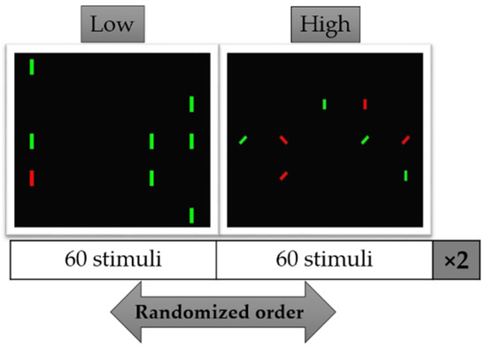 The Conjunction Search Task (CST) was divided into two blocks comprehending 120 trials each, in turn divided into two conditions. In particular, in each block participants performed 60 trials of two different conditions requiring different levels of attentional demand. One of them was a pre-attentive level based on a ‘target’ search task by considering one feature (color). This condition has been defined as a Low condition according to the lower attentional demand required. In contrast, the High condition consisted in the conjunction search based on two features (color and orientation) that require a higher attentional demand. The sequence of the two conditions (Figure 1) was randomized for each participant to avoid habituation and expectation effects. The participants performed 10 practice trials per condition before starting with the experiment. When the practice was done, and the participant was ready to start, the experimental trials began.