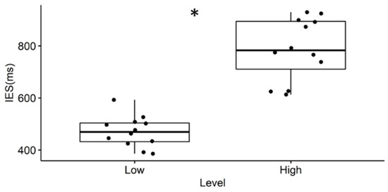 The Wilcoxon signed-rank test performed between the two conditions provides a significant result (Z = −3.094, p = 0.0022): IES during High level is significantly higher compared to the Low level (Figure 3).