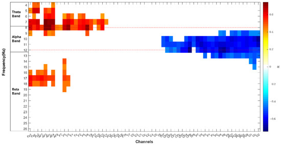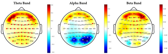 Figure 4 shows the average over the population of the difference between brain activation in the high condition compared to the low condition in the three bands. The color bar represents the difference of PSD values (negative values mean that the brain activity in such area is on average higher in low condition compared to the high condition). According to the statistical analysis, the electrodes significantly (p < 0.05 FDR corrected) more active at the High attention level with respect to the Low attention level were marked in a red color, those more active in the High attention level compared to Low were marked in a blue color, and the insignificant level was marked in grey. The results show that there is a general higher activation of brain activity in all three bands when a higher level of attention is required, except for the parietal and occipital areas in the alpha band. Such an increase in the theta band is diffuse on the whole scalp, and it is localized in the anterofrontal area in alpha band, and on the frontal and centro-parietal areas in the beta band.