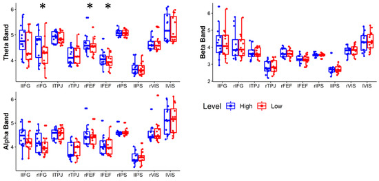Wilcoxon test between the ROI activation in the Low and High conditions in Theta, Alpha, and Beta bands. The asterisk (*) means p < 0.01252 (FDR corrected).