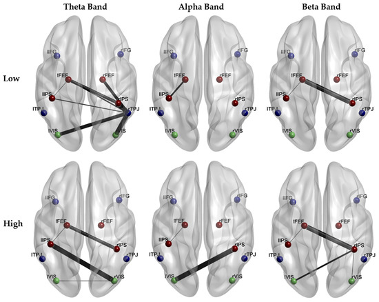 However, real brain functioning is not a static mechanism: neural mechanisms are constrained by connectivity. Therefore, brain connectivity is crucial to clarifying how neurons and neural networks process information. A descriptive analysis of the connectivity patterns showed that ventral attention network, and in particular rTPJ, is strongly connected to dorsal attention networks in the low condition in the theta band. This could be explained by the fact that TPJ plays a more prominent role in attentional shifts when attention and eye movements are dissociated or directed to the periphery of the visual fields [74], a phase that could happen very often in the case of preattention because the subject can easily perceive the target also with the peripherical view. During the high attentional demand level, the main connections are those between IPS and visual areas. The analysis of connection strength confirmed quantitatively that the involvement of visual areas in the high attentional demand condition is significantly higher than in the low condition, probably due to the fact that DAN is expected to exert a greater influence on visual areas in the high condition compared to the low condition and the strength of those connections increases [37,41]. To quantitatively test the hypothesis of the lower segregation of the brain network associated with the high attentional demand, the participation index has been computed because it allows analyzing the role of the node considering also their belonging to a specific subnetwork [75]. The number of connections linking dorsal networks, and in particular rIPS, and visual areas are significantly higher in high conditions compared to low conditions, an indication that IPS exerts an influence on the visual area during spatial orienting [36] and in top-down processes [37]. The effects of top-down mechanisms in high attentional demand are statistically significant, even after the FDR correction for multiple comparisons, whereas we cannot speculate upon those related to the low attentional demand for the lack of significant results after FDR correction. This aspect could be another indication that analyzing attentional processes without a time-locked approach enhances the effects due to task difficulty, allowing the observation, not only of the spatio-spectral distribution typical of high attentional demand, but also its related strengthened connectivity.