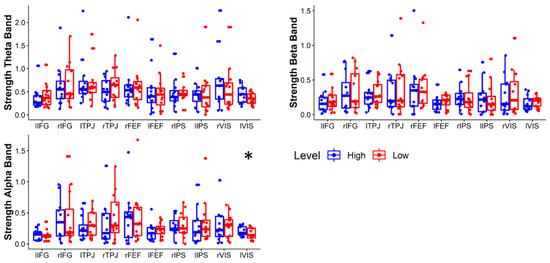 Wilcoxon test of the strength in Theta, Alpha, and Beta bands between Low and High attentional demand. The single asterisk (*) means p < 0.01252 (FDR corrected).