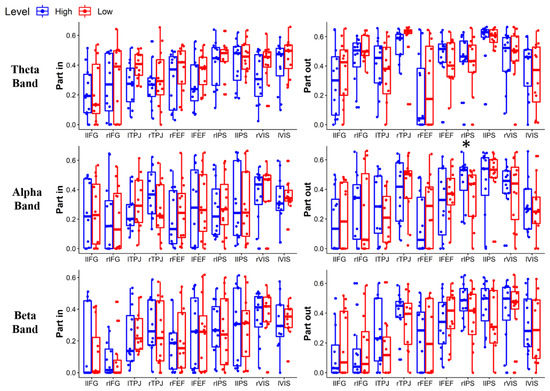 Wilcoxon test between Low and High attentional demand of the participation in (Left) and the participation out (Right) indexes for each ROI and band (rows). The single asterisk (*) means p < 0.01064 (FDR corrected).