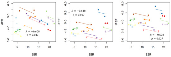 The ROIs provided significant modulation of their activity and have been correlated with EBR, performing a repeated measures correlation (Figure 10). Significant negative moderate correlations have been found in all three cases.