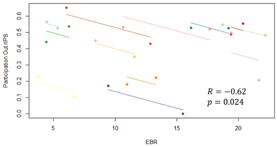 The ROIs provided significant modulation of their strength (i.e., lVIS in the alpha band) and participation index (i.e., participation out in alpha band of rIPS) have been correlated with the significant eye blinks related feature (EBR). Figure 11 shows the plot of repeated measures correlation: a significant negative moderate correlation (R = −0.62, p = 0.02) of the participation out of rIPS in the alpha band with EBR has been found. The strength did not provide a significant correlation (R = −0.324, p = 0.28).