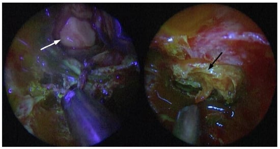 Endoscopic fluorescein-filtered vision of the sellar region; intradural stage, after adenoma isolation from normal parenchyma: non-enhancing adenoma (white arrow) and vividly enhancing pituitary parenchyma (black arrow).