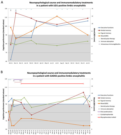 Exemplary cases demonstrating the cognitive monitoring of patients with limbic encephalitis (LE). The figures show the neuropsychological course and immunomodulatory treatments in (A) a patient with LGI1-positive LE and (B) a patient with GAD65-positive LE. The left y-axis refers to the cognitive performances which are presented in standard values. The below average range (i.e., a standard values below 90) is highlighted in grey. The right y-axis refers to the Beck Depression Inventory (BDI) score. A BDI score >10 would indicate depressed mood.