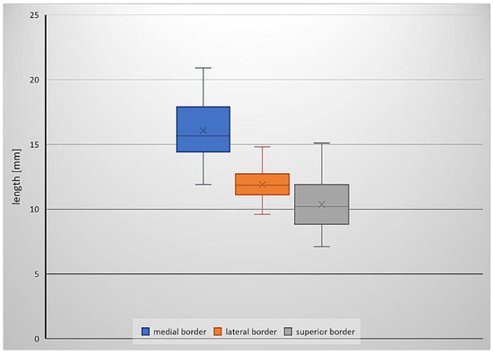 The mean area of the inferomedial triangle in the specimens examined was 60.7 mm2. The mean lengths of the medial, lateral and superior borders were 16.1 mm, 11.9 mm and 10.4 mm, respectively. Basic descriptive statistics (minimum value, maximum value, median and standard deviation) for the measurements and area of the inferomedial triangle are presented in Table 1. Figure 1 is a box plot depicting the lengths of the triangle’s borders.