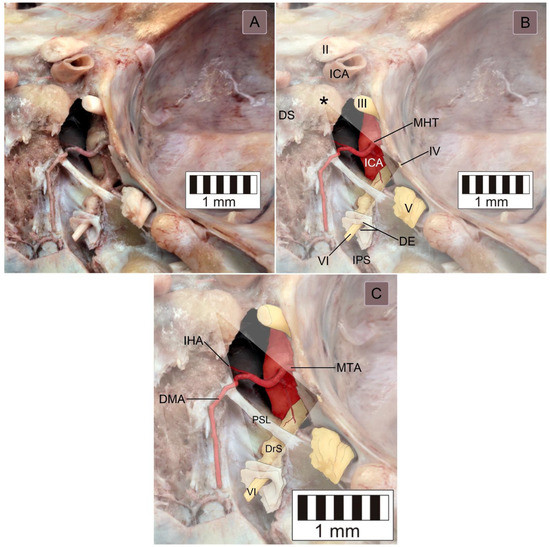 The topographical relationships within the inferomedial paraclival triangle. (A) Posterosuperior view of the right paraclival area of a wet anatomical specimen. The arteries were injected with red resin. The petroclival dura, including the posterior wall of the cavernous sinus, was removed. (B) The same photograph with neurovascular structures digitally color-enhanced to improve clarity and understanding of the topographical relationships. The borders of the inferomedial paraclival triangle were delineated between the posterior clinoid process (marked by a black asterisk), the dural entry point of the abducens nerve (DE) and the dural entry point of the trochlear nerve (IV). The gulfar segment of the abducens nerve (VI) is located between the dural entry point and the posterior border of the petrosphenoidal ligament. The opening of the inferior petrosal sinus (IPS) is visible below the abducens nerve’s dural entrance. The posterior genu of the intracavernous carotid artery and meningohypophyseal trunk are exposed within the triangle. II = optic nerve; III = oculomotor nerve; V = trigeminal nerve; DS = dorsum sellae; and ICA = internal carotid artery. (C) Magnification of (B) showing detailed topographical relationships within the inferomedial triangle. The dorsal meningeal artery (DMA) runs posterior and inferomedially. In this specimen, the course of the artery over the petrosphenoidal ligament (PSL) is atypical. The abducens nerve (VI) within the surrounding dural sleeve (DrS) is located at the confluence of the inferior and superior petrosal sinuses with the basilar plexus. IHA = inferior hypophyseal artery and MTA = medial tentorial artery.