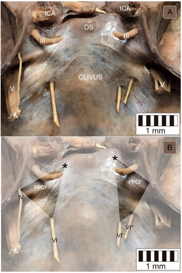 Posterosuperior view to the clivus and paraclival area. (A) Wet anatomical specimen. III = oculomotor nerve; V = trigeminal nerve; DS = dorsum sellae; and ICA = internal carotid artery. (B) The same photograph with the borders of the inferomedial paraclival triangle marked. On the left side, the anatomical relationships are typical; the triangle is delineated by the single abducens nerve (VI) dural entry point, the dural entrance of the trochlear nerve (IV) and the posterior clinoid process (marked by a black asterisk). Note the different positions (asymmetry) of the posterior clinoid processes on both sides. On the right side, the duplication of the abducens nerve is revealed. In this variant, the two nerve trunks (VI′ and VI″) enter the cavernous sinus posterior wall via two separate dural entry points. On this side, the inferomedial triangle is replaced by a trapezoid-shaped area.