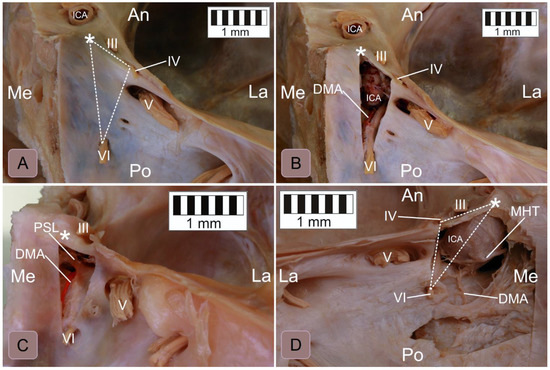 Anatomical variations in the inferomedial paraclival triangle’s contents. (A) Posterosuperior view of the right paraclival area. A dashed line marks the inferomedial triangle. (B) The same specimen after excision of the dura along the triangle’s borders. The petrosphenoidal ligament is absent. (C) Posterosuperior view of the right paraclival area, showing the specimen with the dura excised along the inferomedial triangle’s borders. A well-developed petrosphenoidal ligament (PSL) is exposed. The dorsal meningeal artery (DMA) runs under the ligament within the triangle’s medial half. The abducens nerve (VI), covered by a protective dural sleeve, also runs under the ligament within the triangle’s lateral half. (D) Posterosuperior view of the left paraclival area. In this variant, the dorsal meningeal artery travels out of the inferomedial triangle (a dashed line marks the triangle). Note that the posterior genu of the intracavernous carotid artery occupies the upper half of the triangle. The abducens nerve courses along the lateral triangle’s border. In this specimen, the meningohypophyseal trunk (MHT) is located medially to the triangle. III = oculomotor nerve; IV = the dural entrance of the trochlear nerve; V = trigeminal nerve; white asterisk = posterior clinoid process, An = anterior; Po = posterior; Me = medial; and La = lateral.