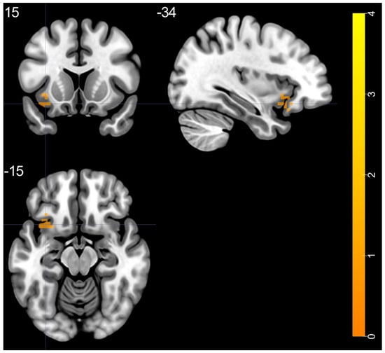 | Brain Regions | Peak T-Scores | MNI Coordinates | Cluster Size (Voxels) | ||