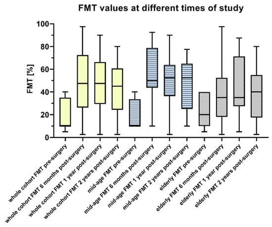 The whole cohort’s FMT score remained stable at one year (39.2% ± 28.2%; z = −0.824; p = 0.41) and two years (38.7% ± 24.2%; z = −0.272; p = 0.79) after cochlear implantation. The comparison between the groups, mid-age and elderly, indicated lack of significant difference (Table 2).
