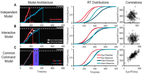 We tested the ability of three different computational mechanisms (Figure 1) to explain the behavior when participants made coordinated saccade and reaching movements toward a target [53,57]. The motor plan for each effector was modeled as a stochastic rise-to-threshold accumulator where the time of threshold crossing represented the RT in a trial. The simplest mechanism of coordination was the independent model in which eye and hand movements are generated by independent systems operating in parallel, driven by a common visual target (Figure 1A). This passive model could not predict any of the three salient features of the eye–hand behavior—mean and SD of eye and hand RT distributions and high RT correlation. We also tested a mechanism called an interactive model, which incorporated an active mechanism of coordination (Figure 1B). This was based on the experimental observation that RTs were different between the coordinated and alone conditions. In the alone condition, the eye and hand movements were executed separately. Notably, eye RTs were delayed by 50 ms, while the hand RTs were faster by 100 ms in the coordinated condition compared to the alone conditions [53]. We incorporated this RT modulation in our model as interactions—an inhibitory interaction from the hand that delays the saccade onset and an excitatory interaction from the eye that speeds up the hand movement during coordinated movements. Despite incorporating an active mechanism of coordination, this model failed to predict two of the salient features of eye–hand behavior, i.e., the high RT correlations and the similarity in SDs of eye and hand RT distributions. A common command model was also tested (Figure 1C). This model suggests that eye and hand effectors are controlled by a common command, modeled as a single stochastic accumulator. When this accumulator crosses the threshold, the eye movement is initiated and is followed by a hand movement after a ‘delay’, which represents the time taken to initiate the hand movement. This mechanism could account for all three salient features—the difference in the means of eye and hand RTs, the similarity of SDs of eye and RT distributions, and also the high RT correlations. Furthermore, we validated this model by electromyography (EMG) of the arm deltoid muscles, which showed that muscle activation preceded saccade onset by 50 ms and was strongly correlated with saccade onset. More importantly, the biomechanical delay measured from EMG onset to hand onset was strongly correlated with the hand delay estimated from the common command model for each subject. These evidences suggest that the common command model is a biologically plausible mechanism that generates coordinated eye–hand movements [53].