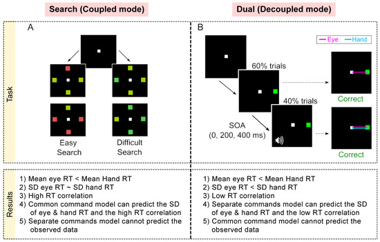 Participants performed Go tasks in two contexts—a search task (coupled-mode; Figure 5A) and dual task (decoupled mode; Figure 5B). We reasoned that the initiation of the two effectors would be coupled or decoupled depending on whether the Go cues for the two movements were common or not, respectively. In every trial of the search task, participants had to make eye–hand movements to a common target presented among distractors, i.e., the Go cue for both effectors was common. In contrast, in the dual task, the Go cue for the eye was the appearance of a peripheral target, while the Go cue for the hand was a tone. Further, the tone was presented only in a minority of trials, ensuring that the target appearance was not predictive of the Go cue for the hand. We hypothesized that the behavior in the search task would be consistent with the prediction of a common command model (similar SDs of eye and hand RT distributions and high RT correlation), while the behavior in the dual task would be consistent with the predictions of the separate command model (dissimilar SDs of the eye and hand RT distributions and low RT correlation). The results were consistent with this prediction (Figure 5 table). In the search task, RT correlations were high (~0.8) and the SD of eye and hand RT distributions were not significantly different from each other despite a ~90 ms difference in their means. Further, this behavior was fit well by the common command model but not by the separate commands model. Conversely, in the dual task, RT correlations were low (~0.3) and both the mean and SD of the eye RT distribution were significantly less than the mean and SD of the hand RT distribution, respectively. Further, the behavior in the dual task could be explained by the separate commands model but not by the common command model. Thus, these results suggest that there are two mechanisms mediating the initiation of eye-hand movements and that, depending on the task context, the brain is biased to one of the mechanisms [77].