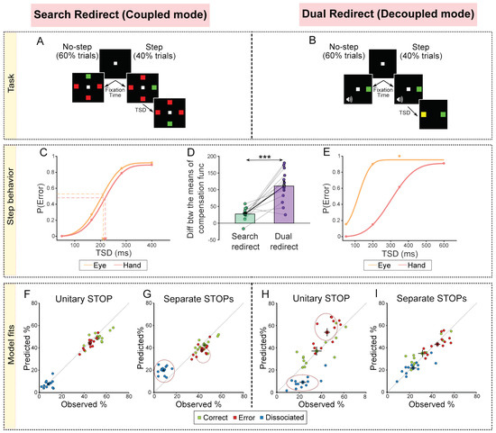 As mentioned above, there is debate as to whether the stopping of eye–hand movements is mediated by unitary or separate STOP processes [62,63,64,65]. These heterogeneous results might be because the movements were generated in task contexts, which biased the brain toward a coupled or decoupled mode. Thus, we hypothesized that, depending on the mode in which coordinated eye–hand movements are generated, the brain can flexibly employ unitary or separate STOP processes to inhibit the movements. To test this, we added a redirect component to the coupled and decoupled Go tasks to study the redirect behavior in these contexts [79]. The extension of the search task was called the search redirect task (Figure 6A). Here, 60% trials were no-step where eye–hand movements had to be made to the target among distractors, while 40% were step trials where the target jumped to another location after a target step delay (TSD). In these trials, movements had to be made to the second target location and not the first target location. Thus, the search redirect task represented the task context where, presumably, there was a common command and unitary STOP at work. Conversely, the extension of the dual-task was the dual redirect task (Figure 6B), again with 60% no-step and 40% step trials. Thus, the dual redirect task represented the task context where presumably there were separate commands and separate STOPs at work.