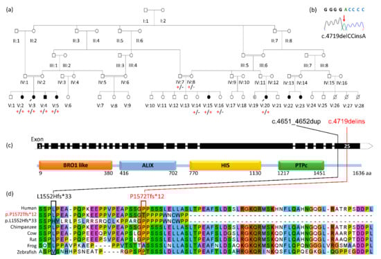 Truncating PTPN23 gene variants that escape nonsense-mediated decay are associated with complex spastic paraplegia: (a) simplified pedigree of the Arab Palestinian family investigated, demonstrating segregation of the PTPN23 variant [‘+’: NM_015466.3:c.4719delins p.(Pro1572Thrfs*12), ‘-’: wild type]. (b) Electropherogram revealing the DNA sequence of the PTPN23 NM_015466.3:c.4719delins variant in homozygous state in an affected individual (Individual V:4). (c) A simplified gene diagram showing exon-intron organisation of PTPN23 (NM_015466.3) and the corresponding domain architecture of the PTPN23 protein. The position of the NM_015466.3:c.4719delins p. Pro1572Thrfs*12 variant is shown [red line] in relation to the NM_015466.3:c.4651_4652dup; p.(Leu1552Hisfs*33) [] [black line]. (d). PTPN23 protein alignment of human wild type and five species orthologues, alongside the predicted outcomes of the p.(Pro1572Thrfs*12) and p.(Leu1552Hisfs*33) variants.