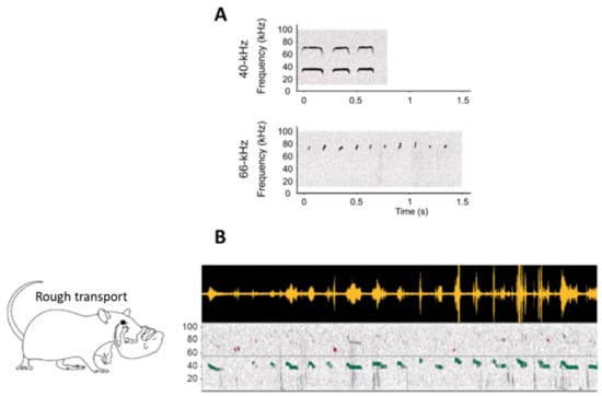 More recently, we suggested that infantile USV might be categorized depending on their frequency rather than their shape []. Using mild foot shock aversive stimulation, we showed that USV could be split in two classes. The first type presents a frequency centered around 40 kHz and a duration around 200 ms, while the second type, akin to the clicks described in the earlier literature [,], is much shorter, being 21 ms on average and presenting a frequency of 66 kHz on average (Figure 1A). These two kinds of infant USV can either co-occur or be emitted separately. Next, we questioned if these infant USV were also emitted in a more naturalistic context when pups received rough treatment from the mother. To do so, rat pups were isolated one at a time in an unfamiliar bedding-free plexiglass cage, after which the mother was introduced. In this new environmental context, the mother spent most of her time exploring the cage, occasionally stepping on the pup, rarely nursing it, and frequently roughly transporting it. This treatment enhanced 40-kHz USV while leaving 66-kHz USV unchanged. Preliminary observations further suggested that rough handling in transport, which is a source of painful stimulation for the pup, was the most efficient stimulus for enhancing 40-kHz USV (Figure 1B).