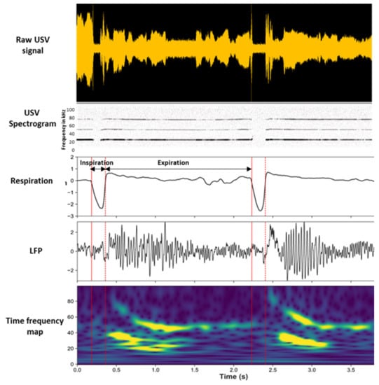 In a recent study [], we investigated the consequences of USV emission on brain oscillatory activities in the fear neural network of the vocalizing animal and assessed to what extent these changes were related to changes in the breathing rhythm (Figure 3).