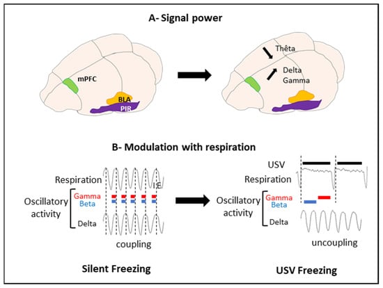 Effect of USV emission on oscillatory activity power and respiration. (A) Signal power. USV emission coincides with a decrease in theta power and an increase in delta and gamma power. (B) Modulation with respiration. Vertical dotted lines mark the transition between Inspiration (I) and Expiration (E). During silent freezing, the delta activity frequency covaries with the nasal respiratory frequency. In addition, power in the beta and gamma bands is modulated in phase with respiration, with a higher beta and gamma activity power during inspiration than expiration. During USV emission, a deep slow-down of respiratory frequency is observed, with the uncoupling between the delta frequency and respiratory frequency. Furthermore, a reorganization of beta and gamma activity power during the respiratory cycle occurs, with increased power during the first half of the expiration phase and increased gamma power during the second half of expiration (adapted from [], Figure 10). mPFC: medial prefrontal cortex; BLA: basolateral amygdala; and PIR: piriform cortex.