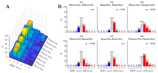 Figure 1. Pattern of weakness in upper and lower limb muscles in ALS patients. These data are from a prospective study of ALS in whom all 4 limbs were affected by the disease (n = 61 patients, n = 122 limbs). Colour scale is autoscaled to the maximum MRC score across all muscle groups. (A) Percentages of individual MRC scores for each muscle group. (B) Difference in MRC score between pairs of muscles for each muscle group. Bars indicate the percentage distribution of differences in MRC score. A positive difference (red bars) indicates that the muscle group receiving the less pronounced CM influence (first muscle group listed for each pair) was the stronger. Blue bars indicate a difference in the opposite direction. The p-value derived from the sign test of these differences is given at the top of each panel (from Ludolph et al. 2020 [68] Permission obtained). - A neurodegenerative process selectively targeting, in its early phase, pyramidal neurons with long corticofugal axons, including CM projections, may result in an UMN syndrome that is different from that caused, for example, by acute stroke or spinal injury to the UMN and its axon. Kinnear Wilson [71] famously questioned the suggestion that ALS could be considered as a disease of the “pyramidal system” because although ALS patients exhibited “awkwardness of finger movements”, they only suffered from slight weakness and there was no spasticity. However, all the recent studies discussed above actually point to a consistent pattern of weakness in the hands and radial digits of ALS patients. Moreover, since selective damage to the CST is well known to result in poverty of hand and finger movement without spasticity [72,73,74], there is no need to invoke higher order motor deficits to explain the symptoms observed in early ALS, although such deficits may well play a part in later stages of the disease.