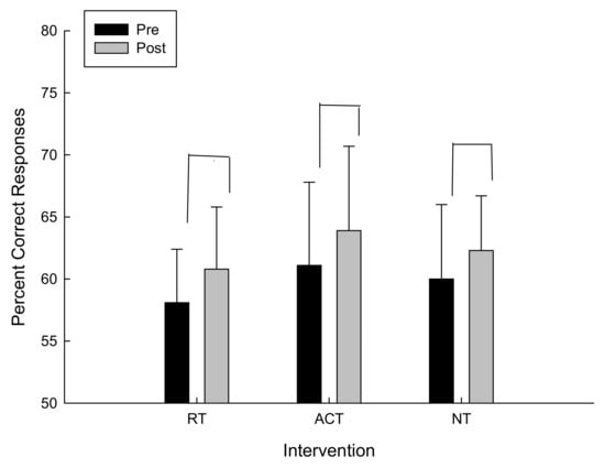For the percent correct responses there was a trend towards conventional levels of significance for the main effect of time F(1,12) = 1.062, p = 0.16 in which the percent correct responses increased in all interventions (refer to Figure 2).
