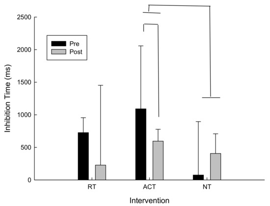 For delta scores (pre-post) for inhibition time (i.e., incongruent response time–congruent response time) there was a trend towards conventional levels of significance for the main effect of time following ACT, t(13) = −1.1, p = 0.15. Post hoc analysis revealed that inhibition time decreased which suggests improved performance following ACT. As can be seen in Figure 3, inhibition time also improved more following ACT than NT. In fact, following NT inhibition times increased, whereas inhibition times decreased following ACT and RT. It is important to note that variability was high in this task. However because this is a within-subjects design and the participants were randomized into three different intervention orders that did not affect the results based on the analysis described in the data analysis section, we are confident that any differences that may appear in the baseline measures were accounted for.