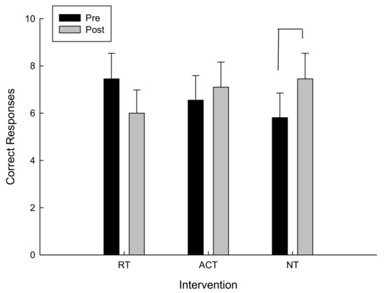 For the total number of correct moves, there was a significant interaction between intervention and time F(2,20) = 3.08, p = 0.034. As can be seen in Figure 4 and confirmed by post hoc analysis, for the total number of correct moves, there was a main effect of time (pre/post) following the NT intervention, t(10) = −1.99, p = 0.038, however there were no significant differences following RT and ACT. The higher the total correct moves, the farther the participant went in the testing protocol and the better the performance.