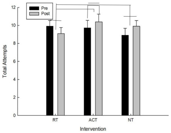 For the total number of attempts there was also a significant difference for improvement (pre-post) between RT and ACT, t(10) = −2.14, p = 0.029 and between RT and NT, t(10) = −2.09, p = 0.032 which is because total attempts increased for both ACT and NT whereas they decreased following RT.