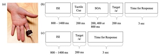 (a) Mechanical tactor used to deliver the tactile cues. Illustration of trials with (b) and without (c) tactile cues. ISI, Interstimulus Interval; SOA, Stimulus Onset Asynchrony.