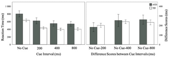 Other research investigating the alerting network in ASD has examined whether the response preparation time affects the alerting responses to preceding cues. For example, using an implicit learning task with visual cues and targets, Landry et al. [] examined children’s behavioral performance in two cue conditions—a variable cue exposure condition (i.e., cues varied in length, with cues of 100, 300, 600, or 1000 ms) and a constant cue exposure condition (i.e., cues were always 100 ms). Additionally, by manipulating the response preparation time (100, 300, 600, 1000 ms) in the constant cue exposure conditions, Landry et al. [] showed that, while children with ASD exhibited a facilitation effect in response to all stimulus onset asynchronies (SOAs), TD children only showed facilitation at shorter SOAs. These results indicate that variable SOAs might differentially impact behavioral performance in the two groups, warranting further exploration of SOAs for understanding the time course of the alerting response in both ASD and TD children.
