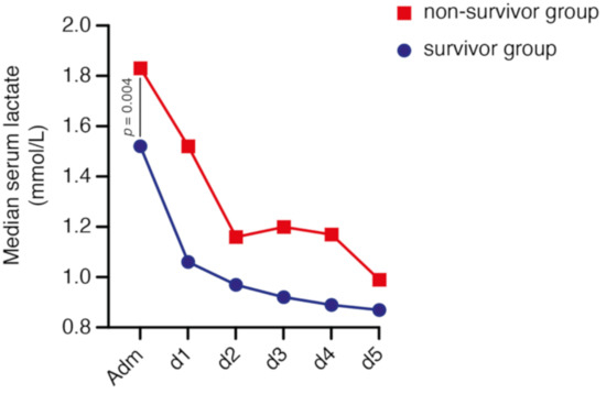 Overall, median admission serum lactate level was 1.56 (IQR 1.18–2.16) mmol/L in all patients. Forty-one patients (40%) presented with hyperlactatemia on admission. In detail, 16 patients with deep-seated ICH who survived (27%), compared to 25 patients of the non-survival group (58%), presented with initial hyperlactatemia (p = 0.002, OR 3.7, 95% CI 1.6–8.6). Median admission serum lactate level was 1.48 (IQR 1.05–1.88) mmol/L in the group of patients with deep-seated ICH who survived and 1.88 (IQR 1.49–2.41) mmol/L in the non-survival group (p = 0.004). Patients with deep-seated ICH categorized in the survivor group exhibited a significantly lower median peak lactate value (1.51 mmol/L, IQR 1.19–2.14), compared to patients allocated to the non-survivor group (2.08 mmol/L, IQR 1.59–2.70; p = 0.001). The course of the median serum lactate values of the initial five days after admission are shown in Figure 1.